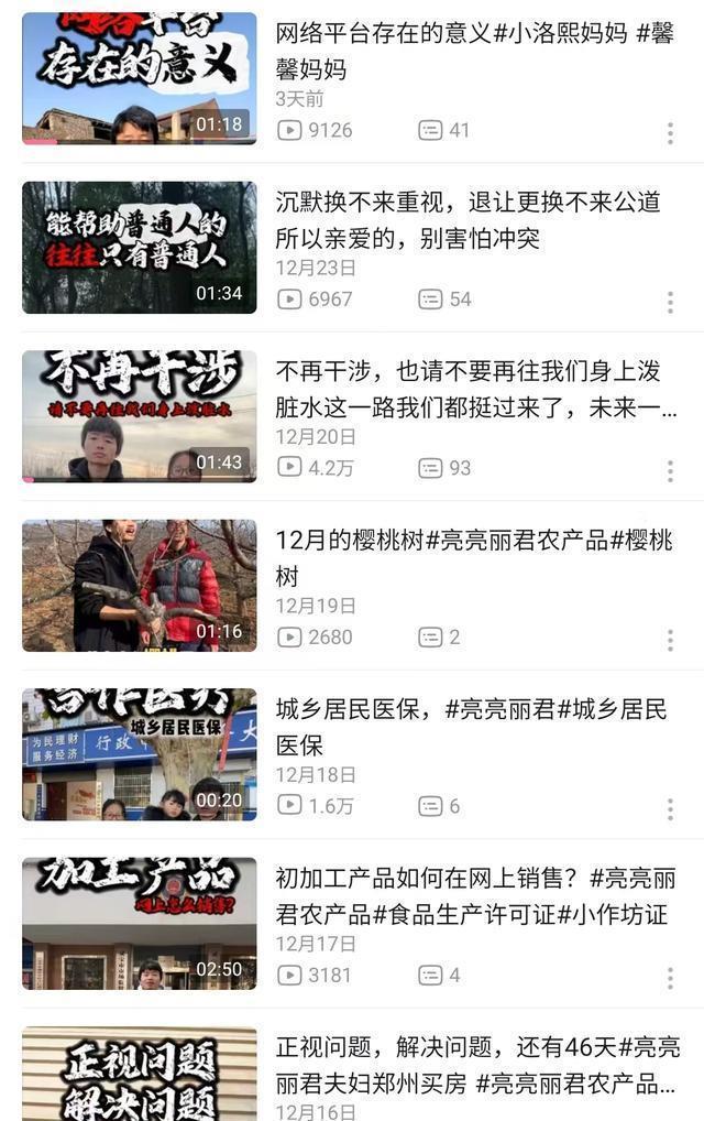 虽然最终通报显示,马翔宇只是一起普通的单位工作矛盾的事儿。但这丝毫不影响,网友们把马翔宇奉为一己之力挑战强权的大英雄。 亮亮丽君夫妇和马翔宇走的是同样的互联网人设: 小人物勇斗无良资本和黑暗势力。 他们和不公斗争,他们为人民发声,他们是正义的代表,他们是敢于和邪恶做抗争的正能量偶像。 然后,凭借着人设,马翔宇转型做网红开启了直播带货生涯。 突然有一天,马翔宇被全网禁言,然后粉丝从200万直接清零。 再然后,小马到期解禁复出,现如今他依然活跃在带货直播间里。 所以,亮亮丽君夫妇的账号应该和马翔宇一样,惩罚性禁言结束后会再次复出的。 清理掉的粉丝,相当于是没收了因某事件非法所得的粉丝。 这样挺好,小两口可以趁着禁言的日子,阖家欢乐的过个春节了。 事儿就是这么个事儿。 除了那次实名举报之外,马翔宇再没有涉足任何一起社会公共事件。 亮亮丽君夫妇也是如此,除了房子外,没有其他能够刺激点燃网友们的绝活儿。 小两口最近一条聊房子的视频,是在12月16号发布的。